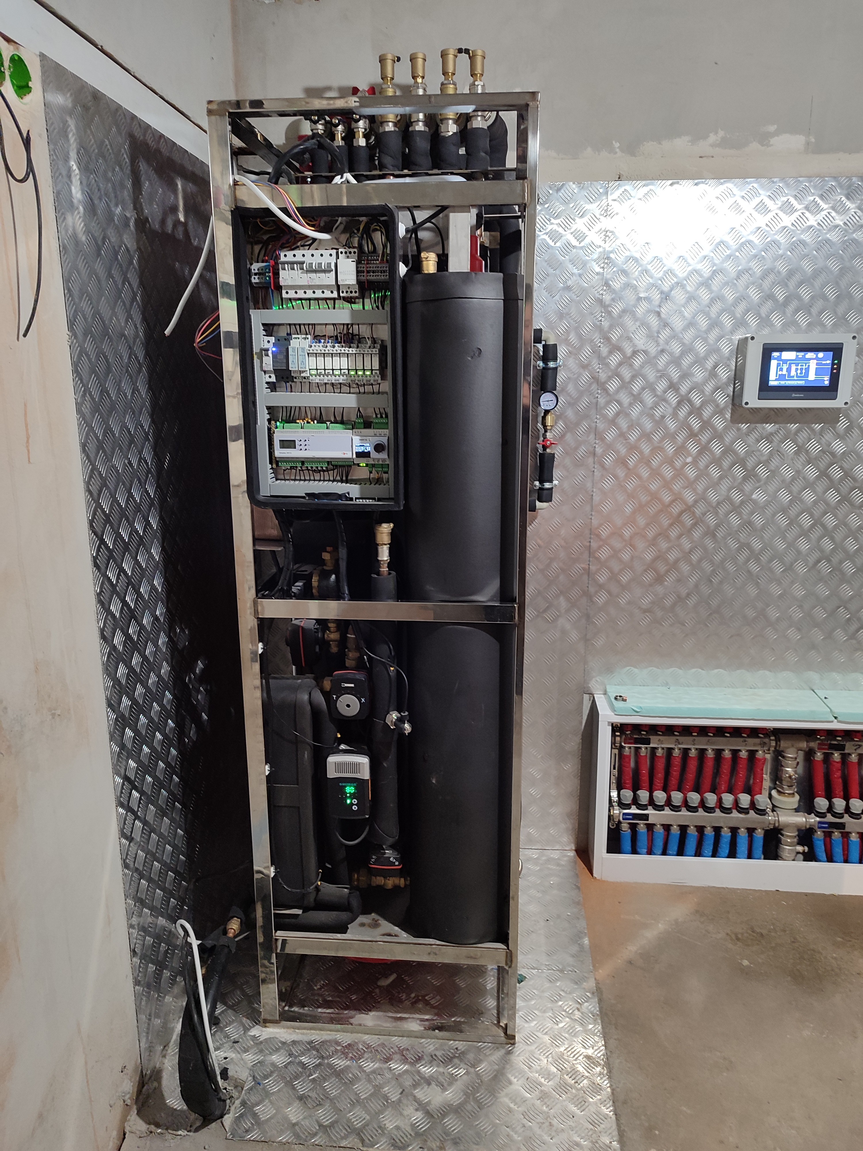 Комплектація внутрішня: тепловий насос, електрокотел, швидкісний бойлер (до 350л гарячої води за першу годину роботи), насоси для систем опалення та охолодження, насос рециркуляції гарячої води, розширювальні баки системи опалення та бойлера, автоматика керування, сенсорна панель.